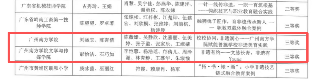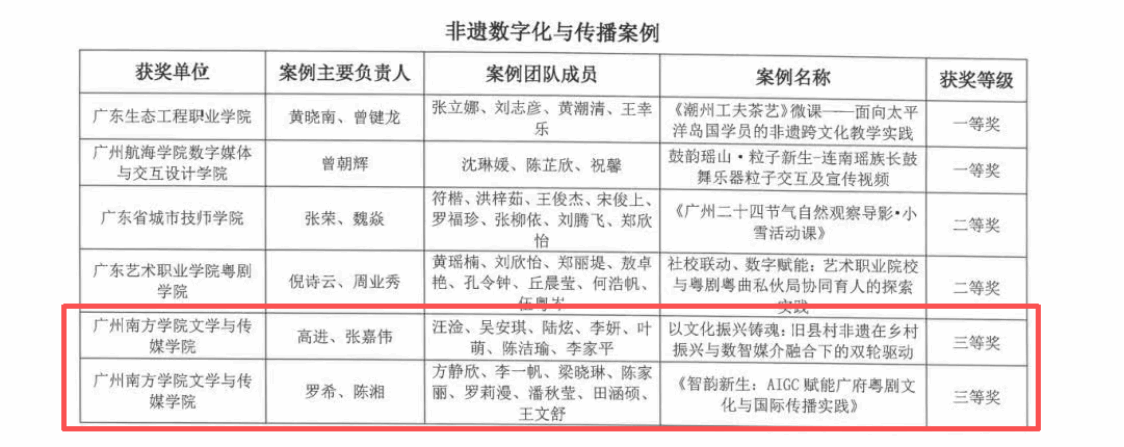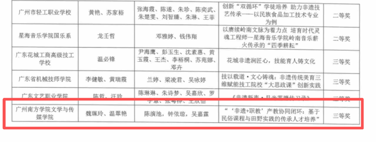 由魏佩玲、温翠艳老师负责的名为《“‘非遗+职教’产教协同闭环:基于民俗课程与田野实践的传承人才培养”》案例荣获三等奖,案例团队成员包含陈演池,钟依琼,吴嘉霖。