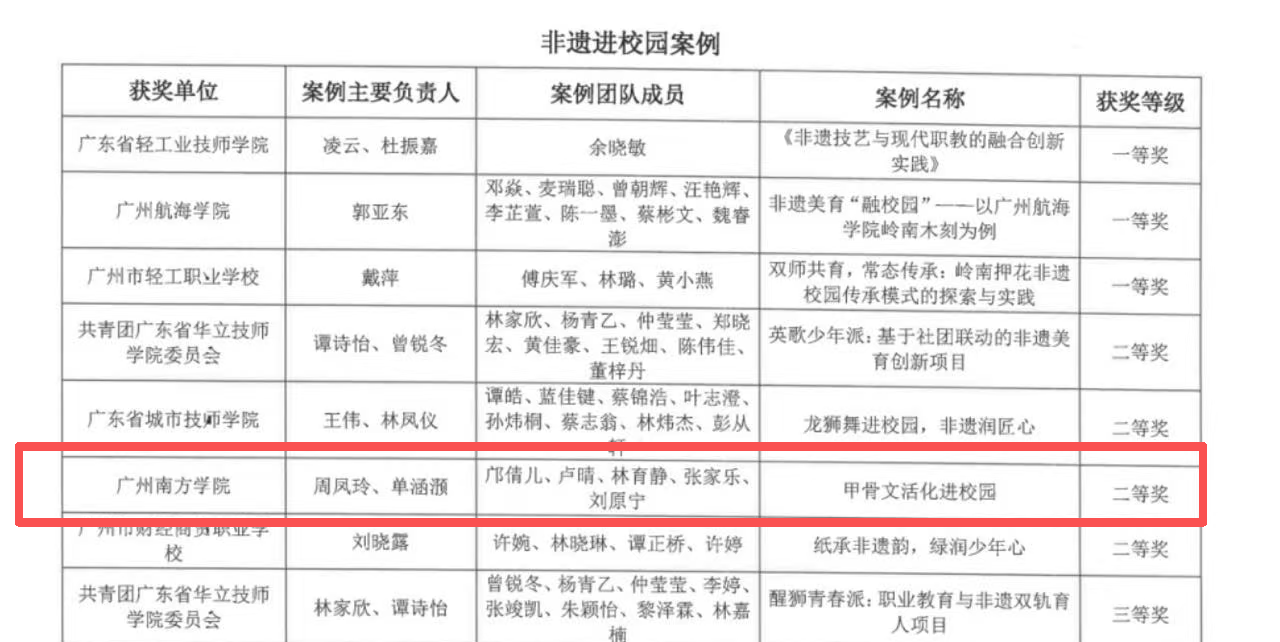 由彭怡洁同学(2023级汉语言文学)、石巧如老师负责的名为《非遗有约一一文脉长青,非遗有Young》案例荣获三等奖,案例团队成员包含李恺蓉、杨浩瑶、邝倩儿、周泽漫、林育静、王慕华、朱淑愉。