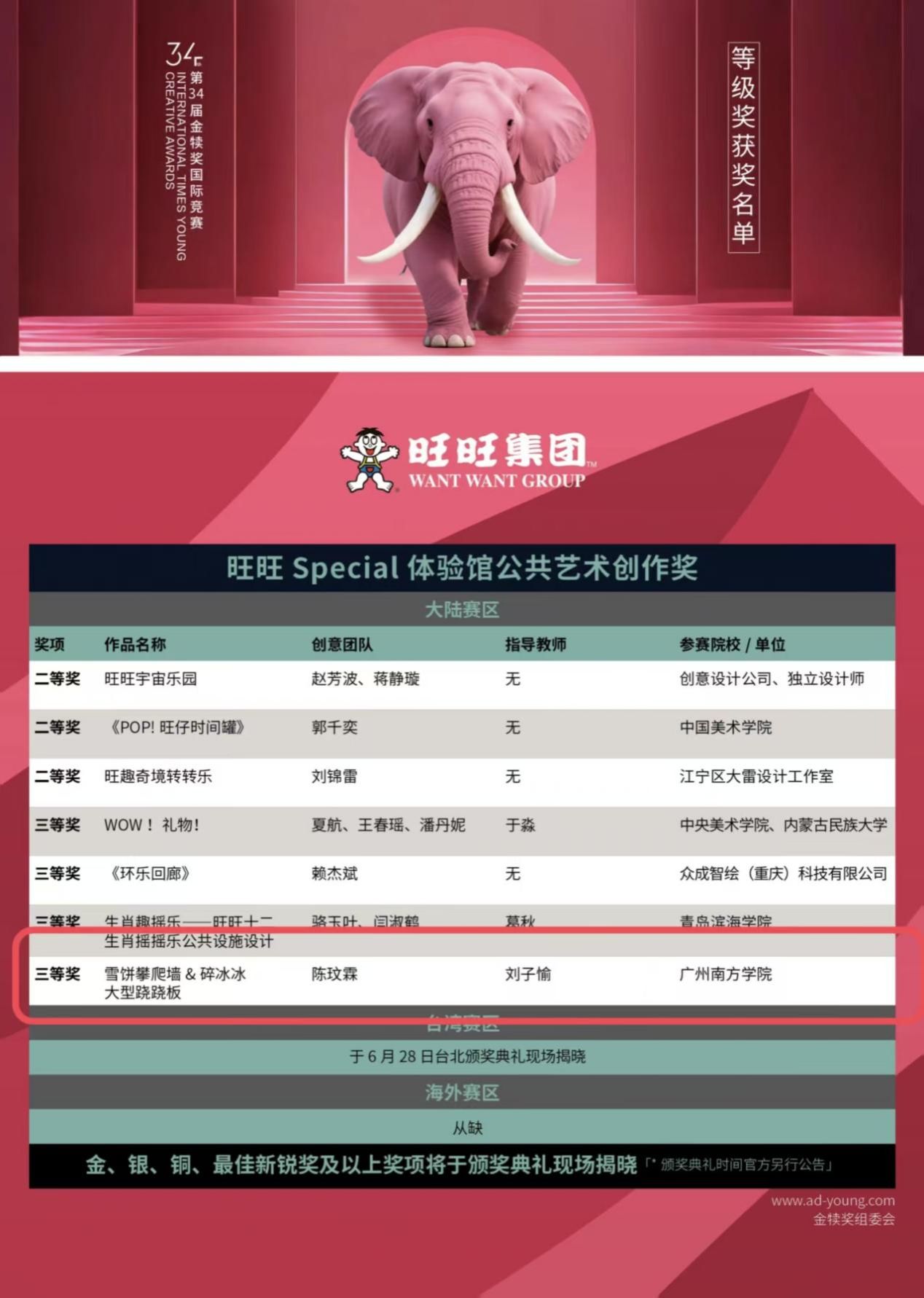 在“第34届金犊奖国际竞赛”中,我院新闻与传播系刘子愉老师指导学生陈玟霖的作品《雪饼攀爬墙&碎冰冰大型跷跷板》获得旺旺Special体验馆公共艺术创作奖国家级三等奖。
