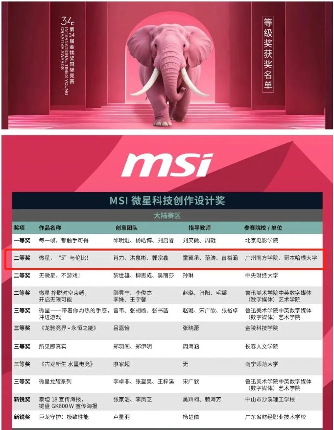 在“第34届金犊奖国际竞赛”中,我院网络与新媒体系童翼承老师指导学生团队(肖力、洪泉彬)的作品《微星,“5”与伦比!》获得MSI微星科技创作设计奖国家级二等奖。