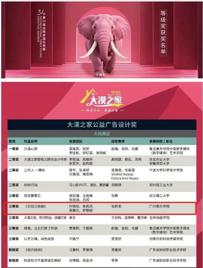 在“第34届金犊奖国际竞赛”中,我院网络与新媒体系张新宝老师指导学生团队(叶晓彤、朱燕凤、周雅云、舒艳妮)的作品《文冠三部曲》获得大漠之家公益广告设计奖国家级三等奖。该比赛是教育部认定的大学生竞赛榜单目录上的赛事。