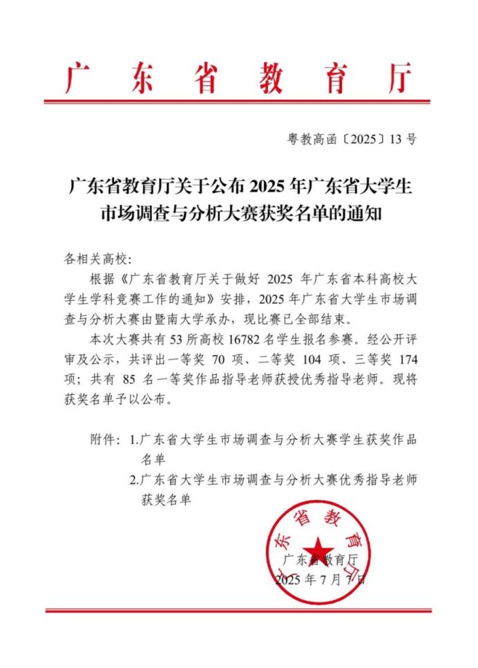 广东省大学生市场调查与分析大赛是省内极具影响力的学科竞赛。2025年大赛由广东省教育厅主办、暨南大学承办。此次大赛吸引了53所高校的学生踊跃报名。
