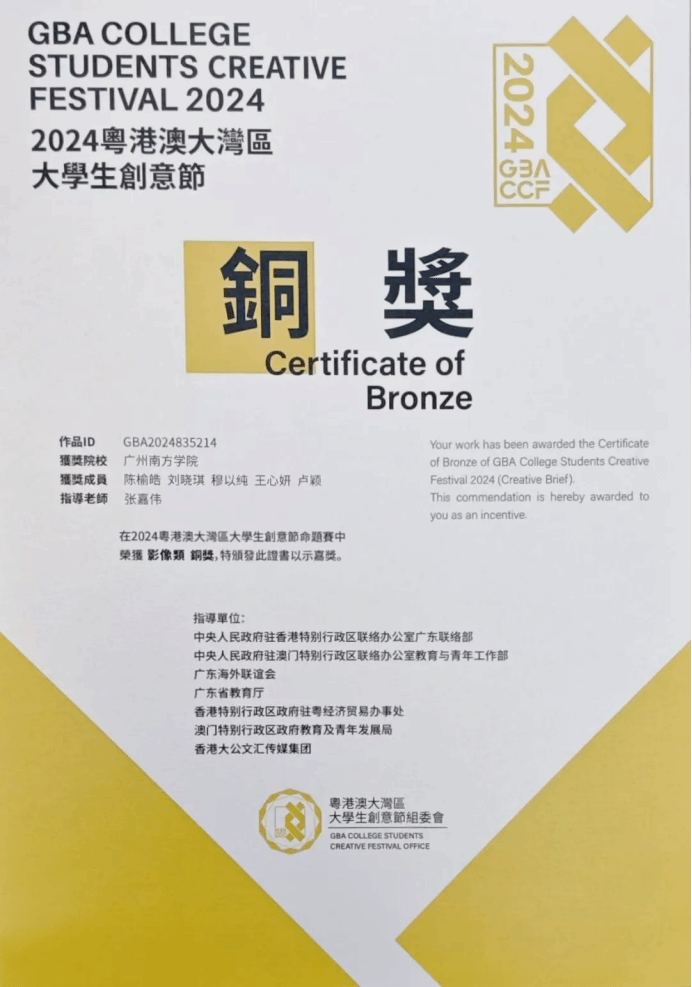 由阚凤霞副教授指导的作品荣获命题赛设计类铜奖,团队成员包括李宛桦、李欣岭和刘钰莹;张嘉伟老师指导的作品获得命题赛影像类铜奖,团队成员为陈榆皓、刘晓琪、穆以纯、王心妍和卢颖。此外,我院因组织工作出色,获得“优秀组织院校”奖。12月29日,由张嘉伟老师带队前往清远参加湾创节颁奖典礼,领取奖项。