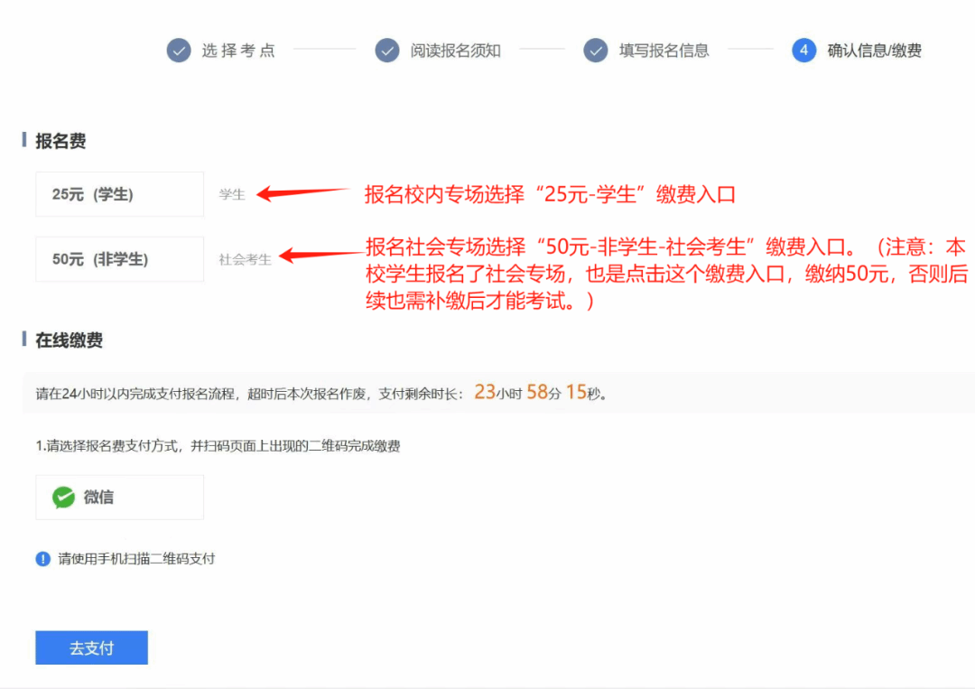 2)考生报名成功后须在规定时间(24H)内缴费,超时未缴费者系统自动删除报名信息;