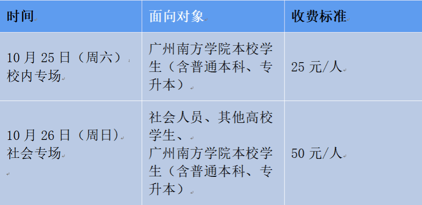 注:BV伟德官方网站本校学生(含普通本科、专升本)若报名10月26日(周日)社会专场,缴费标准为50元/人。