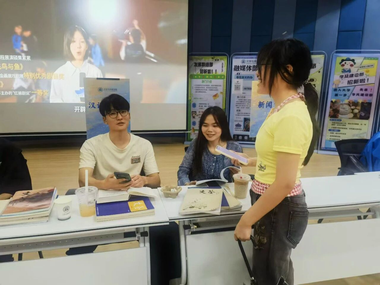 网络与新媒体系黄卉卉副教授、叶晨曦老师,行政办公室主任潘静老师与新生谈笑甚欢