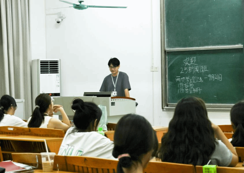 新闻学1班朋辈辅导员叶闻希和新闻学2班朋辈辅导员吴安琪,先进行自我介绍,他们不仅分享了自己的专业学习经验、校园生活心得,还主动留下联系方式,亲切的态度瞬间拉近了与同学们的距离,让大家感受到了来自学长学姐的温暖关怀。然后为大家梳理了班内基本状况。从班级人数、男女比例,到课程安排的初步规划、学院为新生准备的资源支持,每一项信息都清晰详尽,让同学们对即将共同生活学习的集体有了初步认知,也缓解了初入校园的陌生感。
