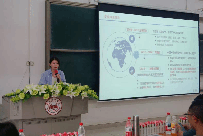 会议伊始,陈珂老师从专业概况入手,结合我院师生共同摄制的新闻学招生宣传片,生动阐释了本专业的教学特色与发展前景。她介绍,我院新闻学专业定位于培养面向粤港澳大湾区、适配数字化传媒产业发展的应用型传播人才。专业师资力量雄厚,课程体系完善,教学注重实践实训。设有应用新闻传播、数字影像传播、品牌传播三个特色模块,同学们可根据自身兴趣与职业规划灵活选择。同时,陈珂老师还分享了优秀校友的成长案例,他们在传统媒体、新媒体等多个领域发光发热,成为行业砥柱。
