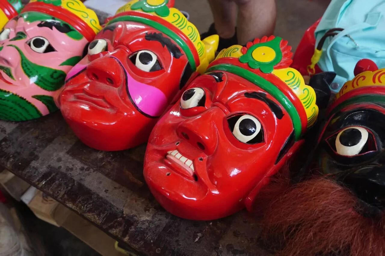 阳光斜照进旧县村湛江傩舞文化陈列馆,旧县傩舞的特色面具、道具和服装熠熠生辉。傩舞以驱邪逐疫、祈福平安为核心,每年农历正月十五及年例期间举行盛大仪式。表演者佩戴象征神将的木刻面具,代表土地公、土地婆及车、麦、李、刘、洪五员神将,手持斧、锏、链、刀、令旗等兵器,在唢呐与打击乐伴奏下演绎古朴动作。