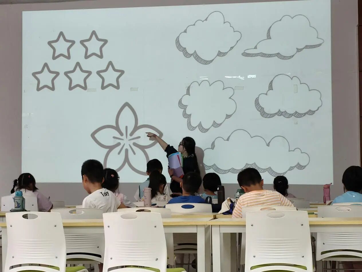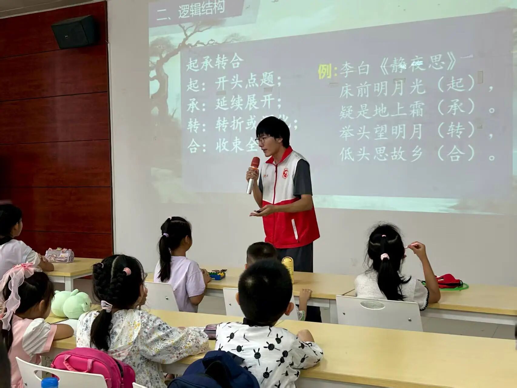 授课伊始,他先引导小朋友们了解诗词中常见的主题;随后,以 “起承转合” 这一诗歌基本结构为切入点,帮助小朋友们掌握诗歌创作过程中的关键环节;接着,通过讲解意象与平仄知识,让小朋友们初步体会诗词的深厚底蕴,理解诗人创作时在遣词造句上的严谨态度;最后,邓森华同学提供了符合韵律的字词组合,使小朋友们能够顺利完成自己的第一首五言绝句创作。