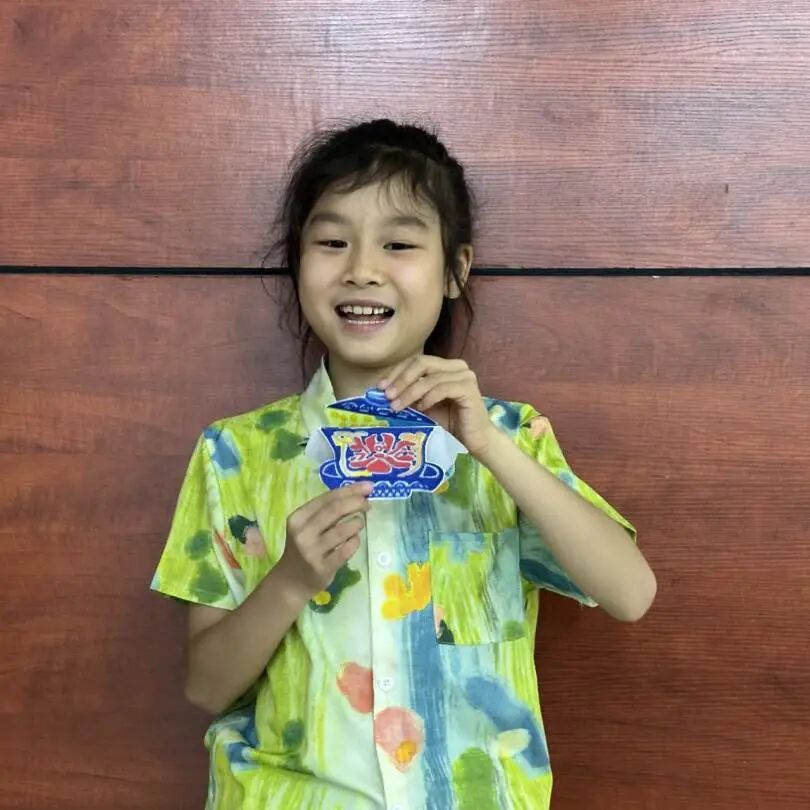 聚焦中国非物质文化遗产的力与美,从醒狮鼓点中的雷霆腾跃,到龙舟竞渡时的百桨破浪,再到皮影戏幕后的镂光雕影。郭芸裳同学通过非遗文化课程带领小朋友们了解并领悟“狮舞驱邪纳吉”“龙舟和舟共济”“皮影以影载道”的精神内核,在锣鼓与桨声间,培养对动态遗产的守护使命感,让千年律动叩响当代心弦。