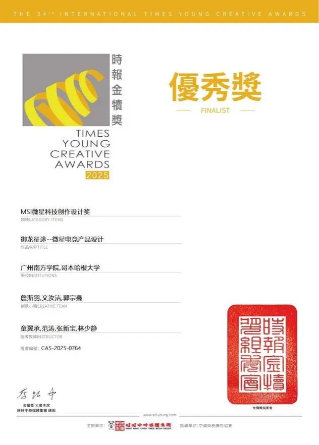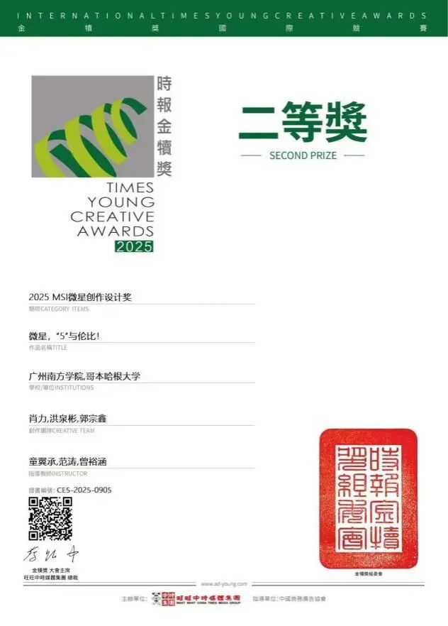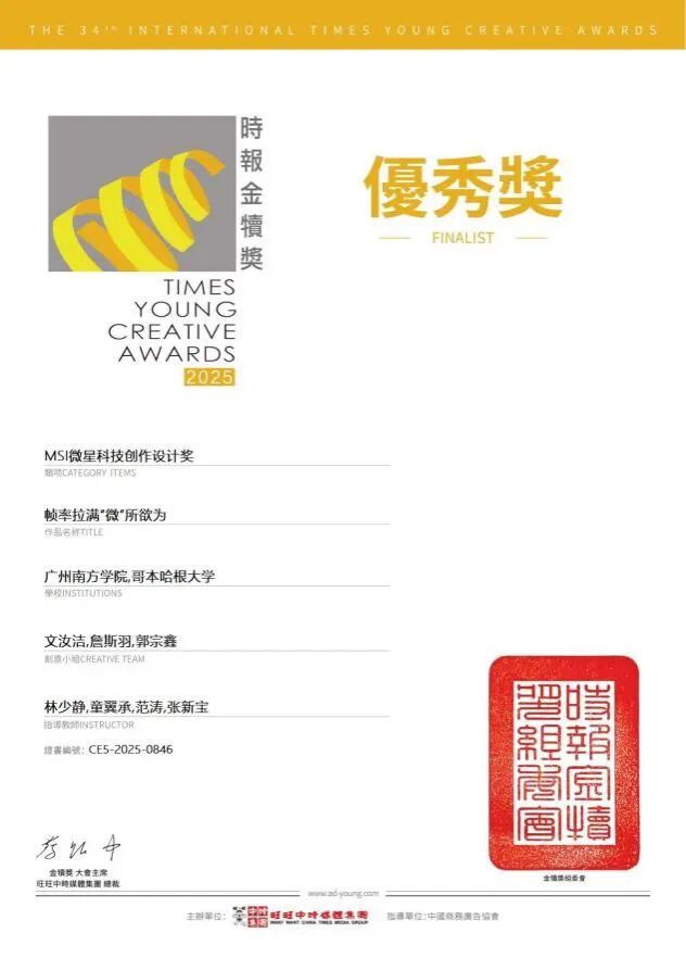 另一件获奖作品《微星,“5”与伦比!》由网络与新媒体专业学生肖力、洪泉彬共同创作,指导老师为童翼承老师。该作品以富有创意的动画形式,生动展现了微星品牌的科技实力与文化内涵,以青年化的视觉语言增强了品牌感染力。