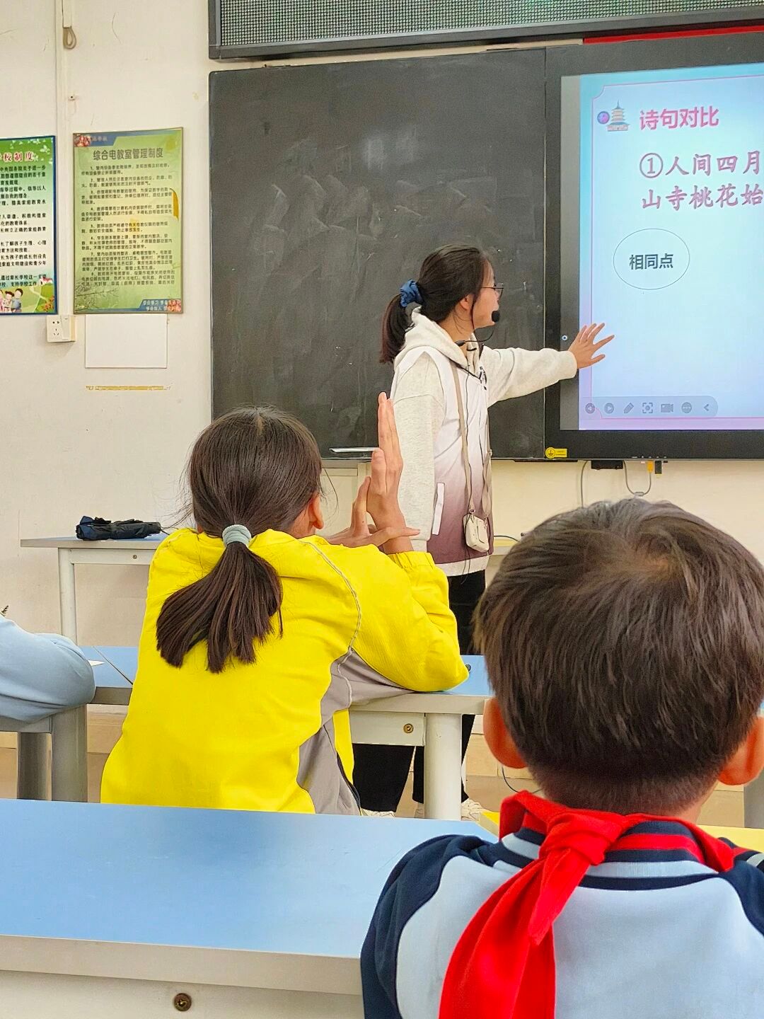 随后,小卢老师讲解了白居易写作的背景,帮助同学们更加深入地理解他“人间四月芳菲尽”的惆怅忧愁与“山寺桃花始盛开”的惊喜。同时,她通过”和春天捉迷藏“这般生动的比喻,将白居易诗中从惆怅到惊喜的情感转变诠释得淋漓尽致,让同学们沉浸其中。