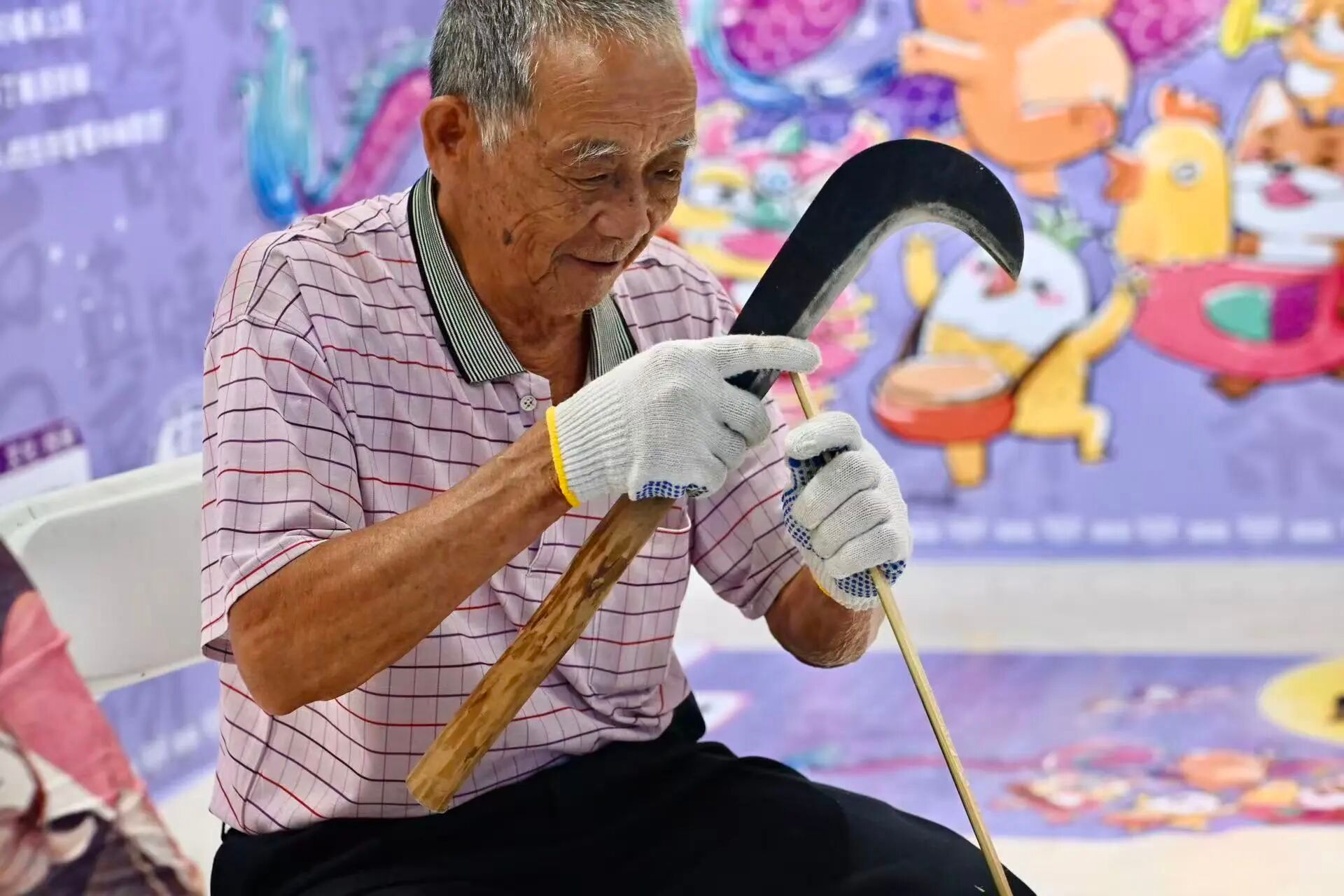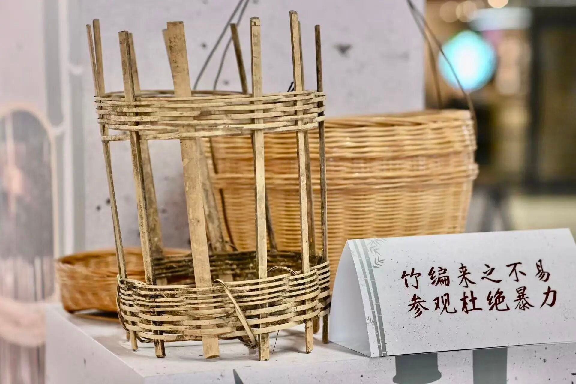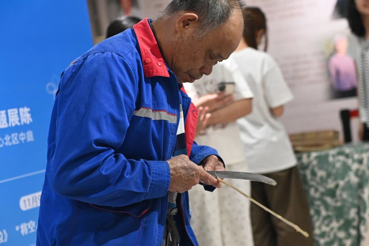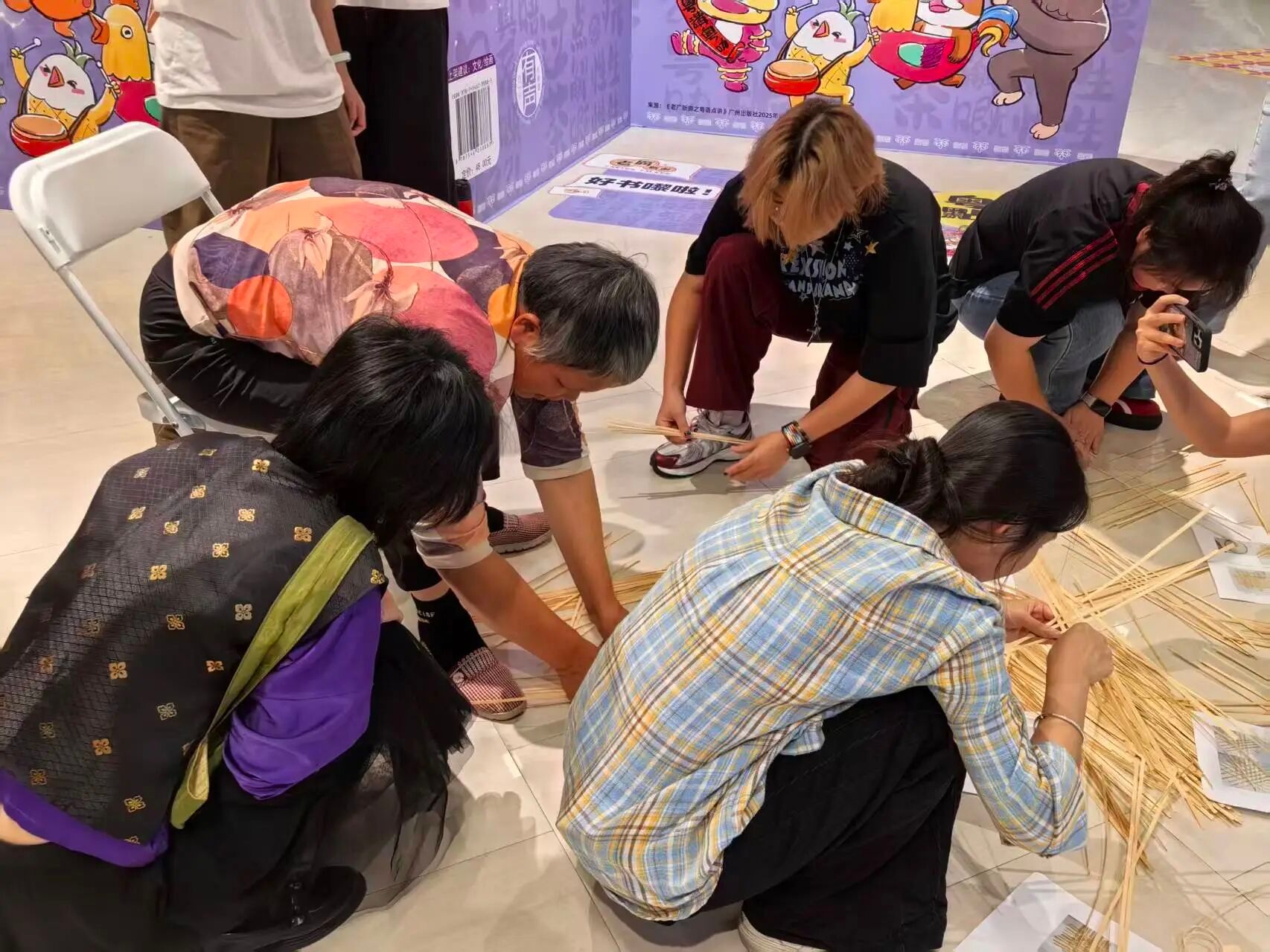 最让人期待的竹编体验开启了,观众们可以亲手尝试竹编。工作人员将预处理的竹篾、齐全的工具包和说明书整齐摆放,老人们坐在观众中间,耐心指导每一个编织步骤,从排列固定竹子到压挑编织,再到为自己的小作品收尾,手把手教学耐心地教学。