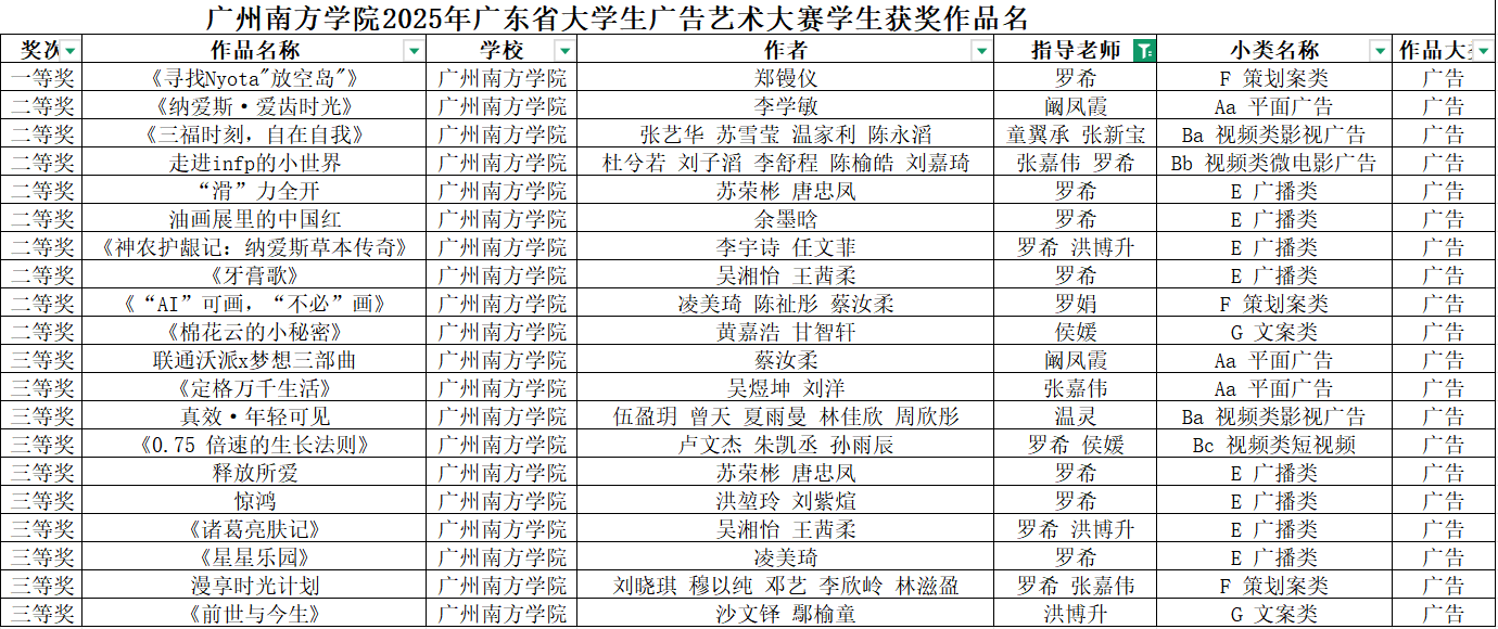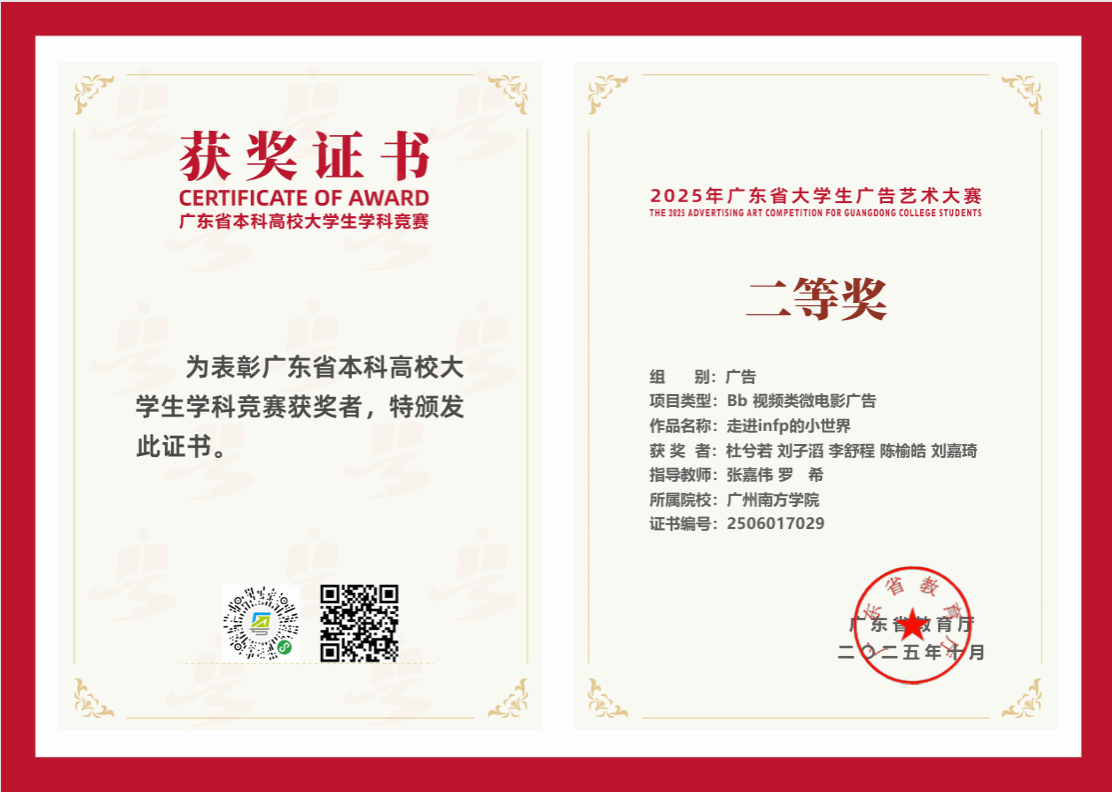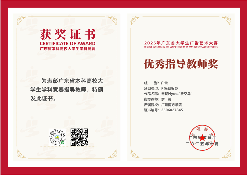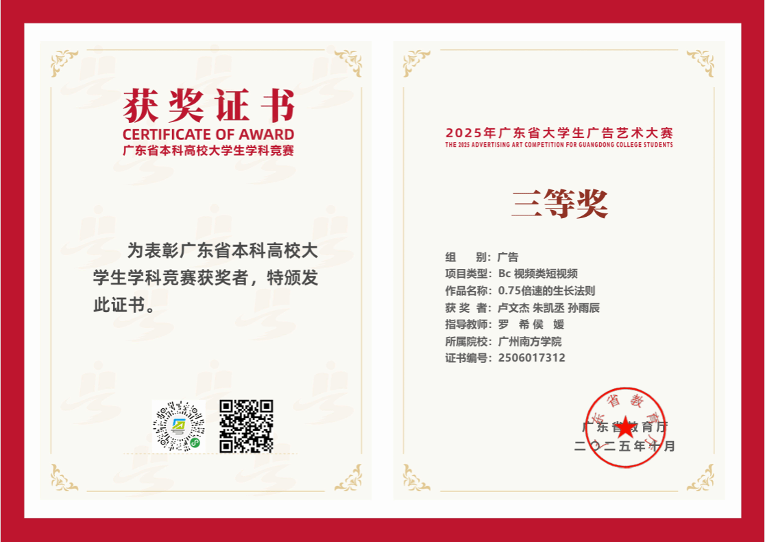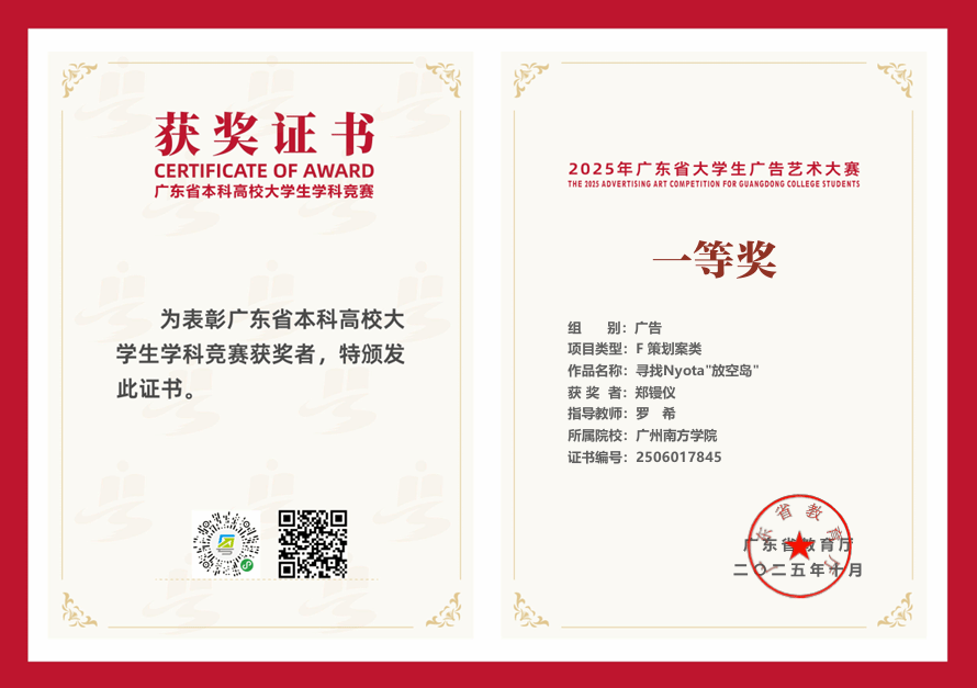 在创意涌动、竞争激烈的2025年广东省大学生广告艺术大赛舞台上,我院学子凭借卓越才华、不懈努力与无限创意,过关斩将,斩获令人瞩目的成绩,为学院争得了荣誉。