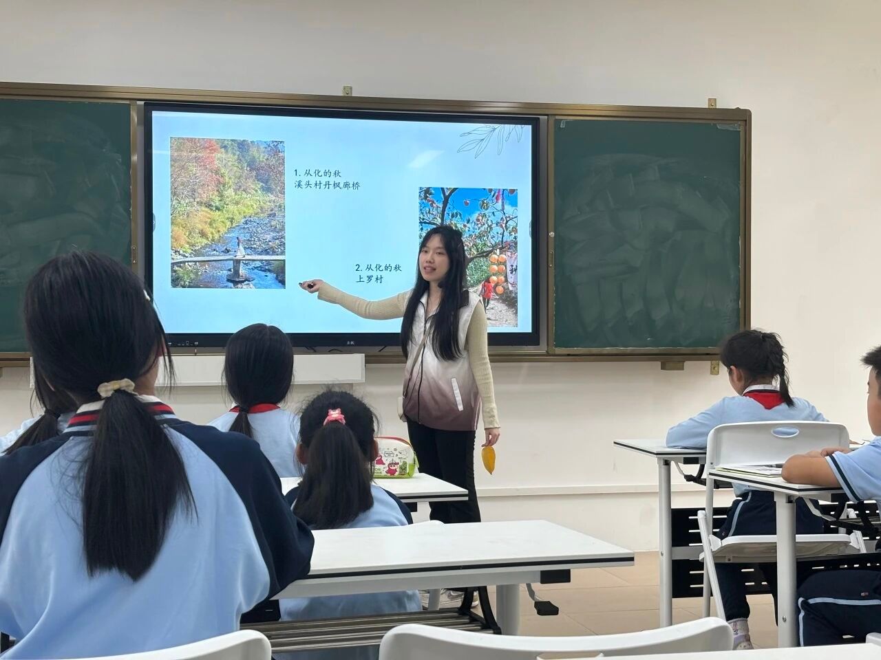 在以落叶点开同学们的思维后,课堂进入到下一环节。小高老师向小同学们展示了两幅秋意盎然图片:一幅流溪小桥上的人影,一幅收获时节的柿树。她让同学们选择一张图片,并引导小同学们以观察兼想象的方式去感受图片中的景色。在第一幅图片中,同学们“听”到了溪水的潺潺声响,看到了溪边橙黄的丛叶。有位小同学综合运用了比喻手法与“五感”,将溪边的枫叶形容为“火红的,如手掌一般大”,得到了小高老师的赞扬。