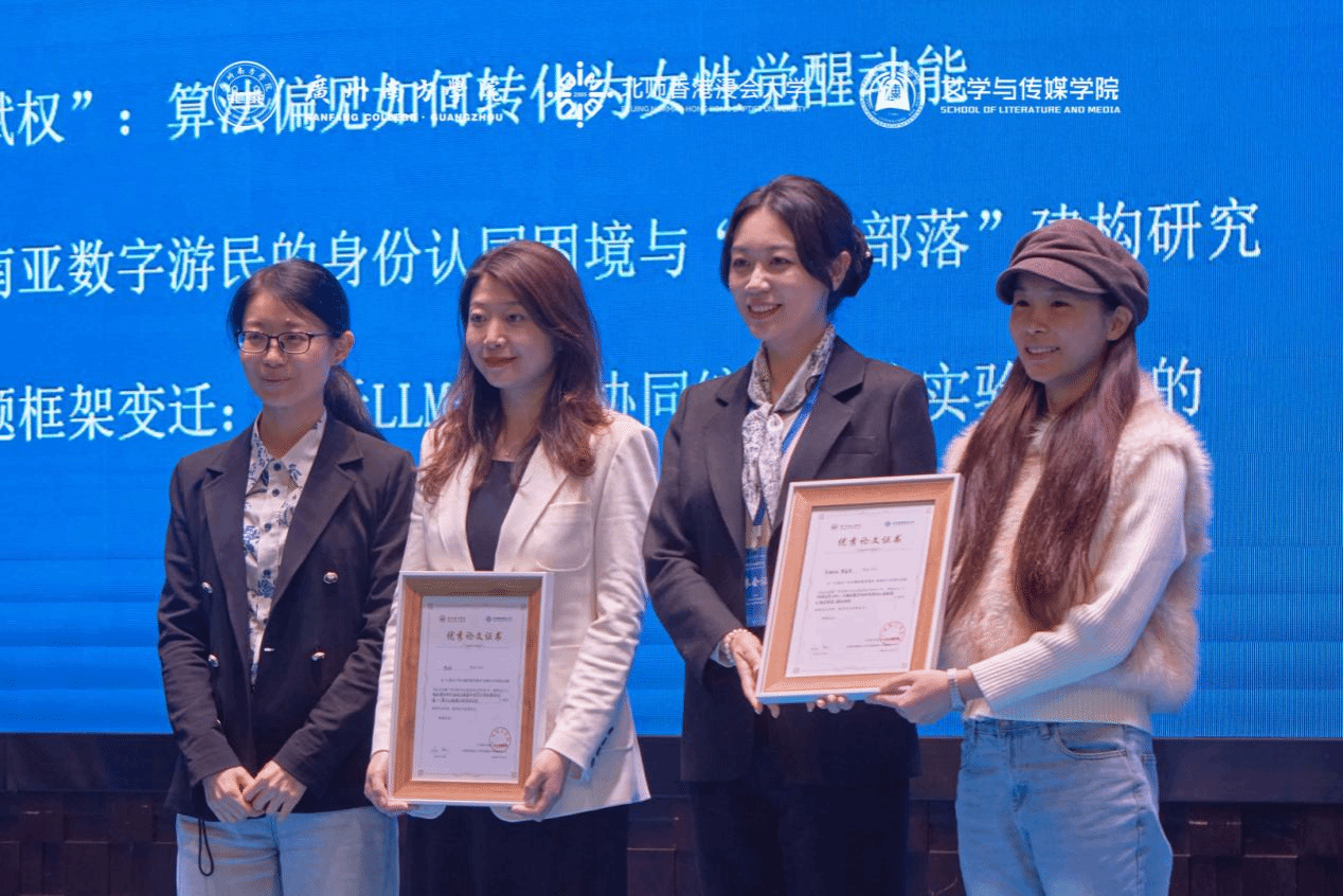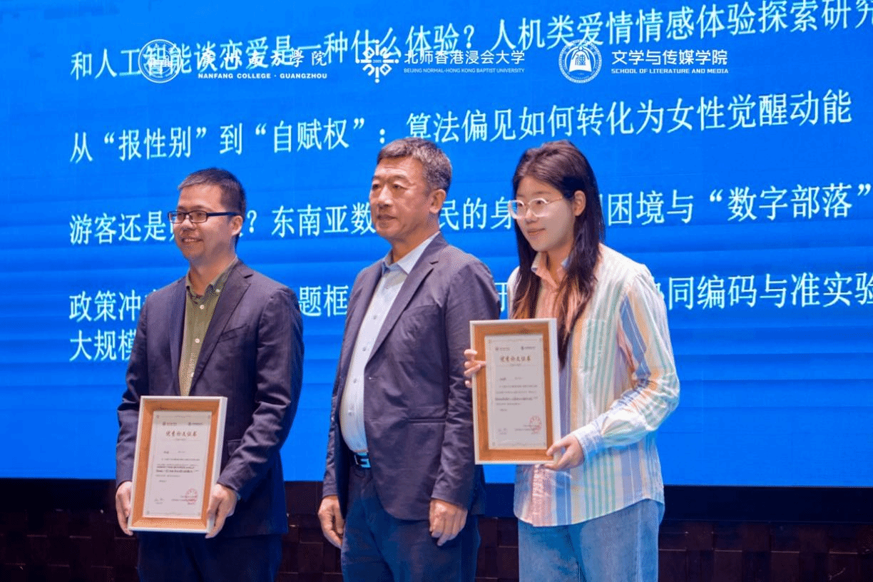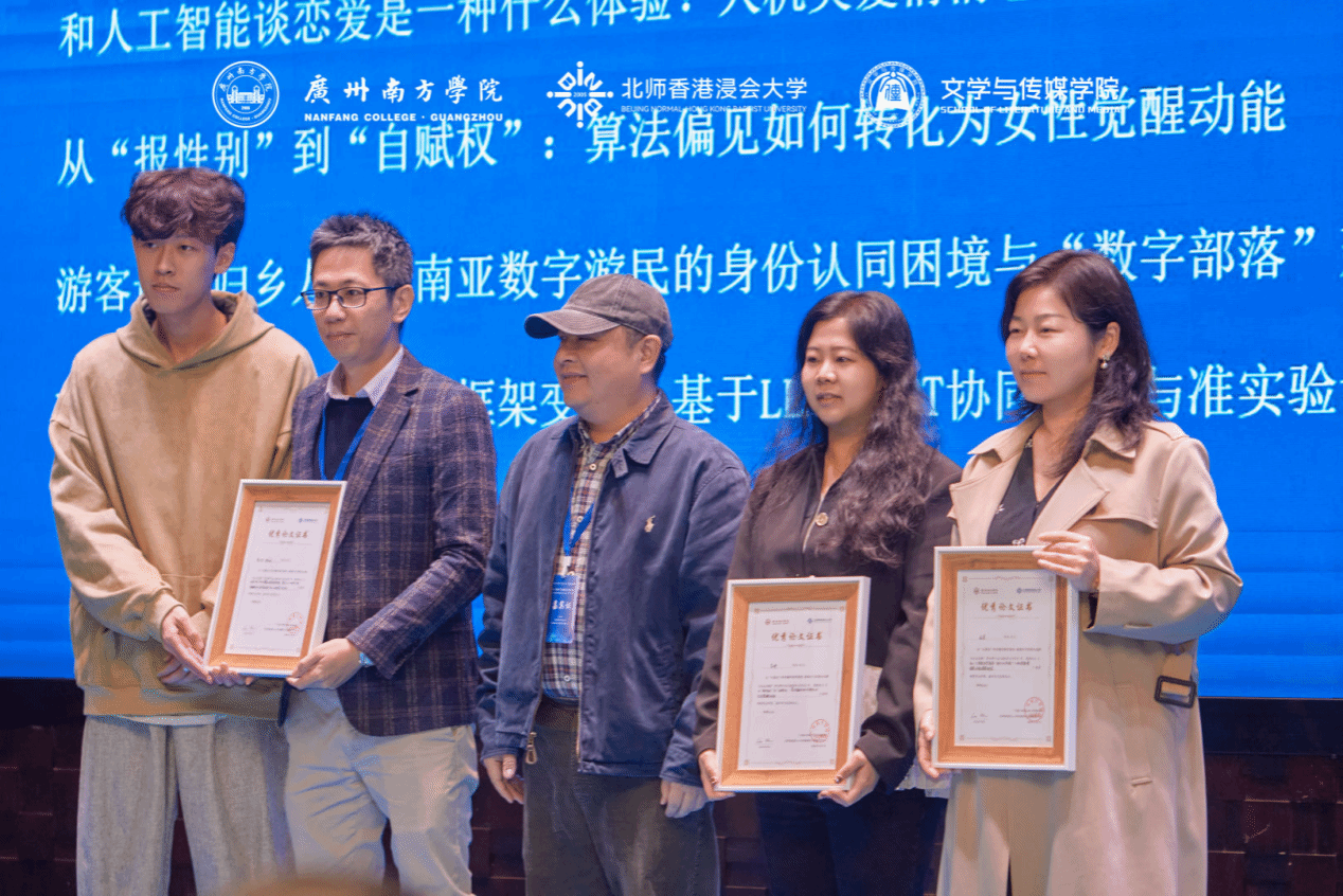 随后,大会举行了简短而隆重的颁奖仪式,对在此次研讨中获评“优秀论文”投稿作者予以表彰。多篇优秀论文围绕AI技术与传播教育改革展开深入思考,体现了青年学者扎实的学术功底与开放的学术视野。