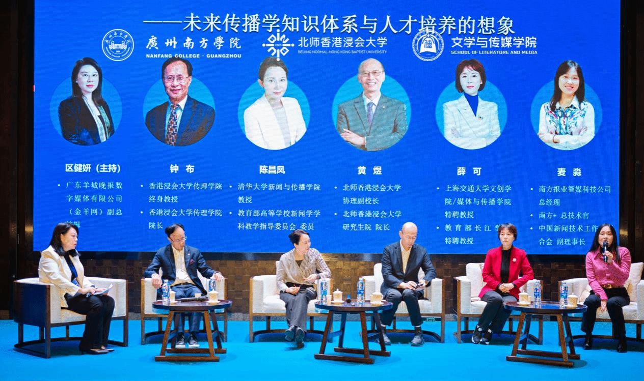 12月7日上午的圆桌论坛环节,清华大学新闻与传播学院陈昌凤教授、北师香港浸会大学协理副校长黄煜教授、香港浸会大学传理学院院长钟布教授、上海交通大学文创学院/媒体与传播学院薛可教授、南方报业智媒科技公司总经理兼南方+总技术官麦淼、广东羊城晚报数字媒体有限公司(金羊网)副总编辑区健妍六位嘉宾围绕“未来传播学知识体系与人才培养的想象”这一话题展开深入对话。