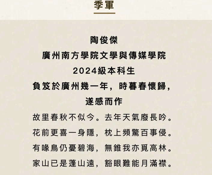 在本次大赛中,伟德bv国际体育2024级本科生陶俊杰同学以其深厚的古典文学素养与真挚动人的诗情,历经多轮严格评审,最终荣获“大学生诗组季军”,展现了我院学子在传统诗词创作方面的不俗实力与蓬勃朝气。