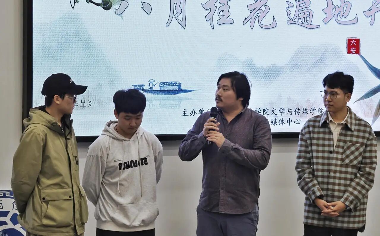 放映结束后,各短片主创团队依次上台,分享创作背后的点滴故事:师生们踏寻革命旧痕,记录非遗匠心。在张小溪、陈涛、张嘉伟、袁勋、林少静、童翼承、吴迎春老师的带领下,团队每位成员满怀热忱,不停步履,以镜头为笔,将六安的红色精神与人文风华,细细镌刻进每一帧画面里。