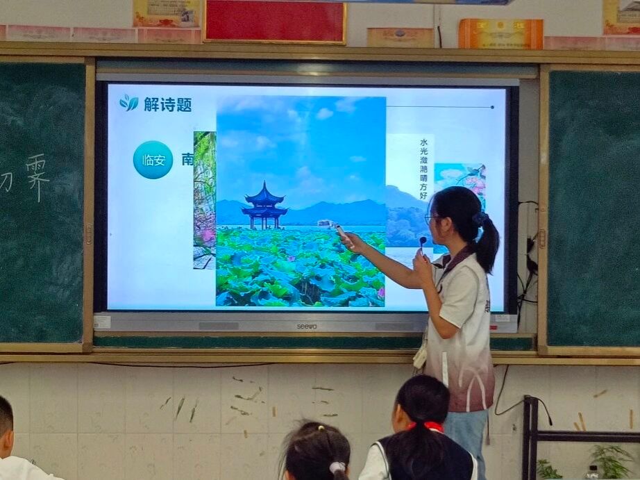 课堂之初,小卢老师从陆游的《示儿》《十一月四日风雨大作》等诗篇入手,引出陆游的另一面——无奈惆怅。紧接着,小卢老师以两张有趣幽默的图片将孩子们深深地带入课堂,向孩子们提问:“从图片中你们能体会到什么心情?”孩子们边思考边发言,回答不一,课堂氛围融洽热烈。小卢老师抓住这个机会解诗题,让孩子们更好地掌握了《临安春雨初霁》的含义。临安,南宋都城,今浙江杭州,明明是一个枯燥无味的知识点,小卢老师却以一张张杭州西湖的美景照,让孩子们身临其境参与其中,体会诗中的审美意境。