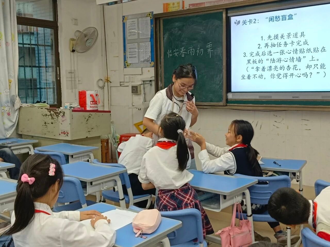 临近课堂尾声,小卢老师与小朋友们进行互动小游戏——“闲愁盲盒”,让孩子们抽任务卡,并且体会任务卡上的心情,最后以该卡片上的词语为条件问:“拿着漂亮的杏花却只能坐着不动,你觉得开心吗?”孩子们回答:“不开心”,这个游戏真真切切的让孩子们体会诗人的心情,走进陆游的内心世界。