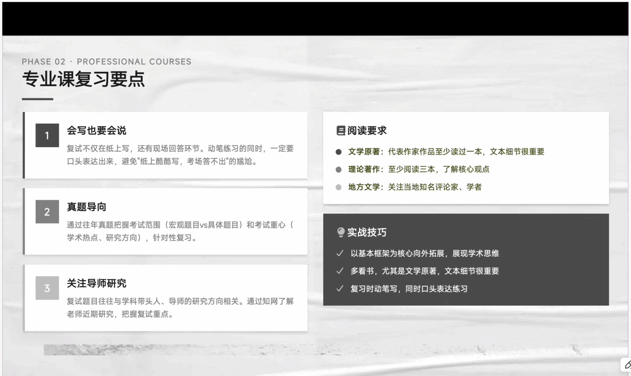 主讲人结合自身备考与读博经历,强调了专业课复习需严格依据参考书目,并拓展阅读学科经典著作与前沿论文。针对复试,他建议提前关注学科热点,查阅导师研究方向。此外,他还分享了心态调整的方法,鼓励同学们记录备考日记,保持积极状态。对于有志于学术深造的同学,主讲人建议在研究生阶段尽早规划科研路径。