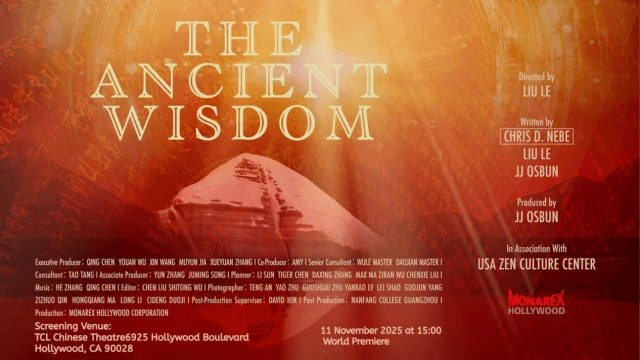 2025年11月11日,由伟德bv国际体育刘乐老师主创,美国好莱坞Monarex电影公司出品,与已故好莱坞著名导演、制片人克里斯·蒂·里比(Chris D. Nebe)合作完成的文化纪录片《古老智慧》,在美国洛杉矶好莱坞中国戏院举行全球首映。国内外多家媒体——中国日报网、美洲华联社、广州日报新花城对此影片进行了报道。影片以影像语言传递中国禅宗智慧,展现中华文化的深邃与当代价值,成为中国文化走向世界的生动实践,也是我院“以生为本、实践育人、融合培养”办学理念的精彩体现。