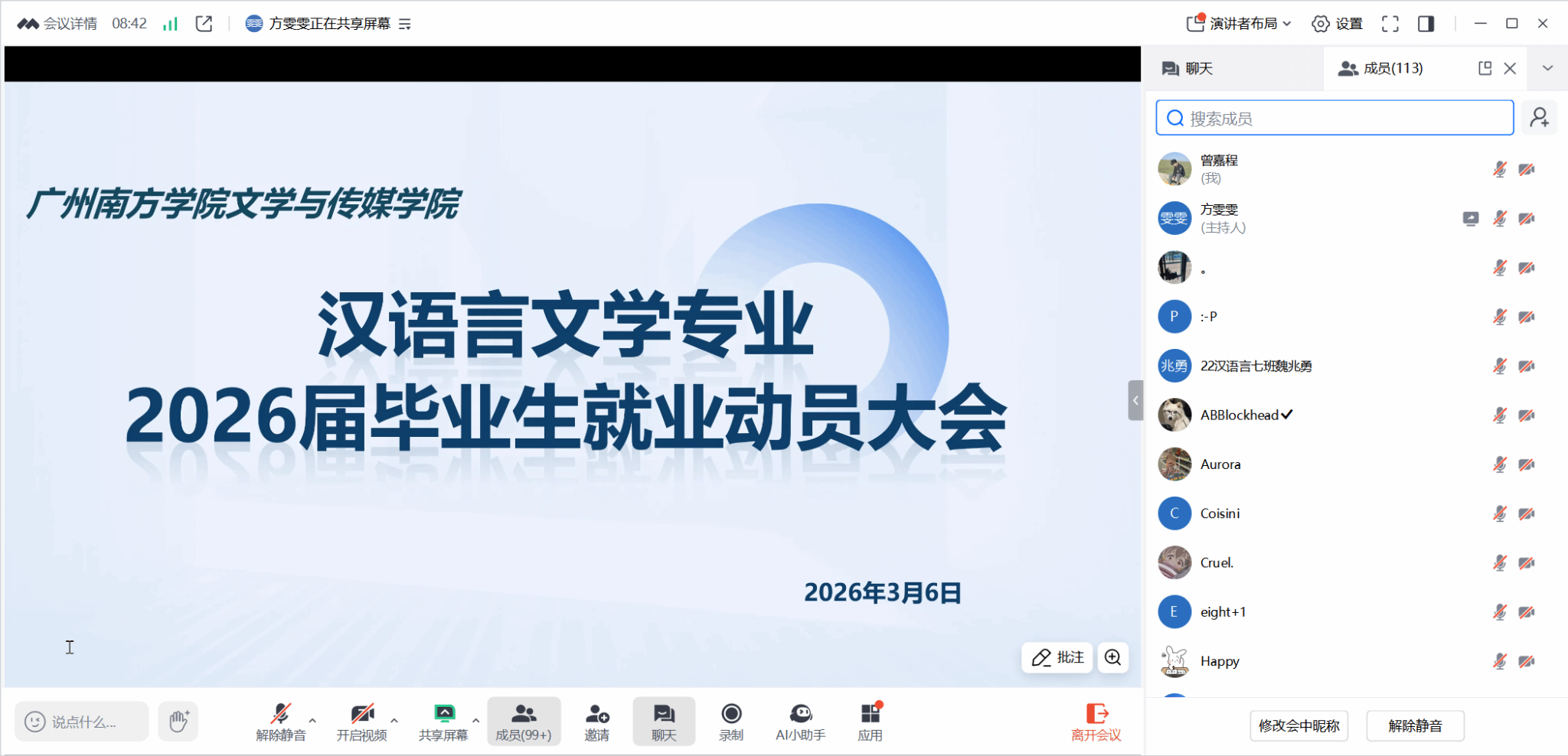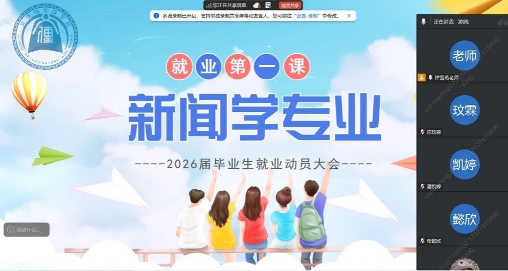 大四年级召开线上毕业动员会,副院长游鸽副教授、新闻与传播系主任陈珂副教授等出席。游鸽副院长分析就业形势,鼓励学生保持信心、积极投递简历,同时警惕招聘陷阱;陈珂副教授详细介绍专业培养方向与就业前景。辅导员老师们从技能提升、心态调整、毕业节点、心理支持等方面给予指导,强调学院将始终作为学生坚强后盾,希望大家平衡学业与就业,勇敢迈向新征程。会议为2026届毕业生提供了全面就业指导与心理支持,帮助明确方向、增强信心。