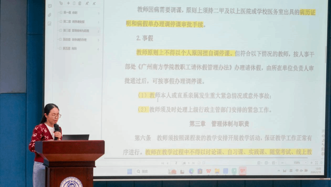 随后,潘静老师围绕办公事项作了详细说明。她重点就调停课制度、教学事故认定办法、请销假制度、预约访问等事项进行了系统介绍,进一步明确了相关工作流程与规范要求。她提醒全体教师要严格遵守学校和学院各项规章制度,强化程序意识和规范意识,确保教学、行政等各项工作高效有序开展。