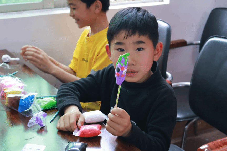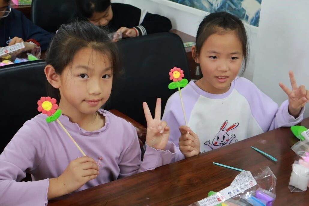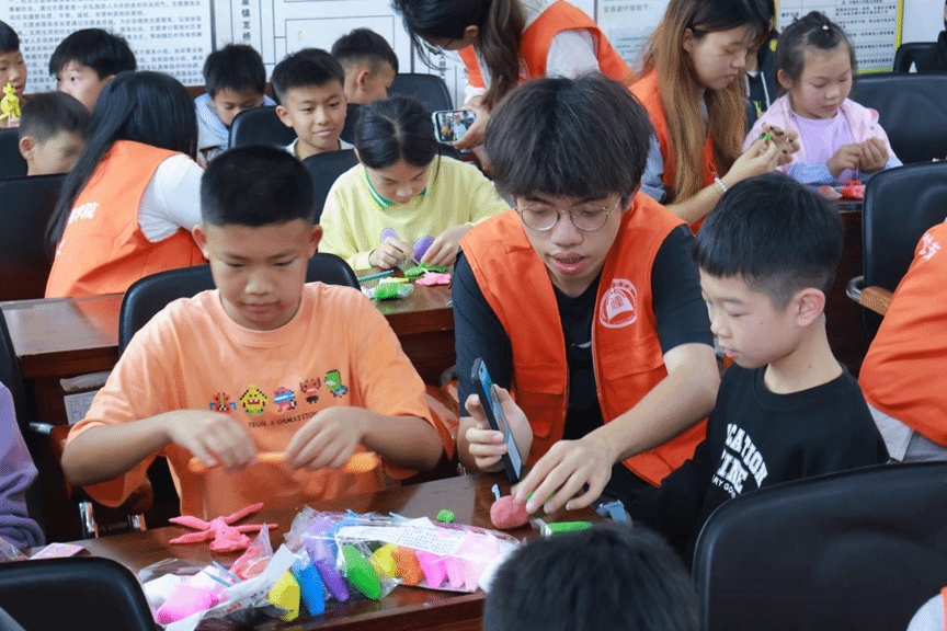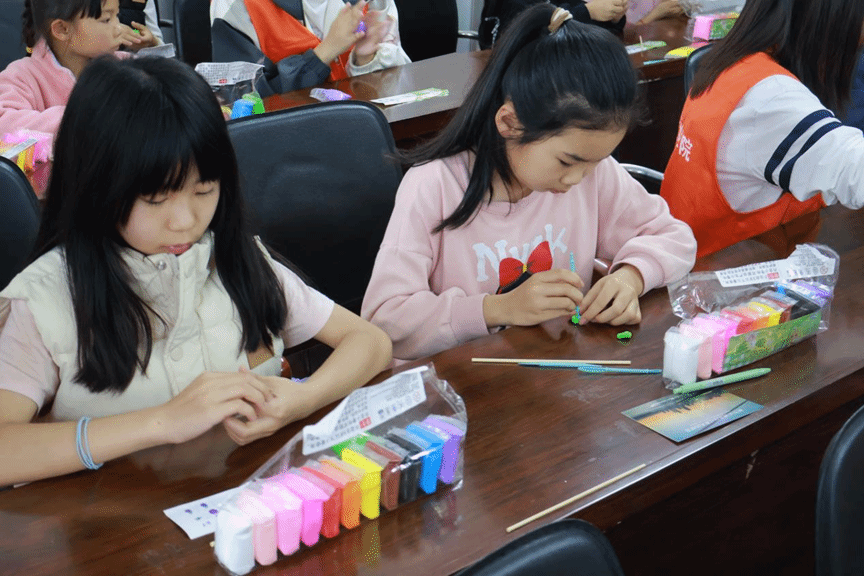 随后的面塑手工体验环节,是孩子们最期待的时刻。志愿者们分组指导,为孩子们分发超轻粘土、竹签、垫板等材料,手把手教学揉、搓、捏、压等面塑基础手法。从经典的小雷锋帽,到憨态可掬的熊猫、兔子,志愿者耐心示范,孩子们认真模仿,指尖翻飞间,一块块普通的粘土变成了各式各样的可爱造型。志愿者们全程陪同,提醒孩子们注意安全、保持整洁,让每个孩子都能完成属于自己的面塑作品,在动手实践中感受传统非遗的匠心之美,体会创作的快乐。