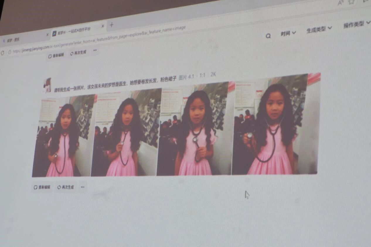 当传统非遗遇上现代科技,碰撞出别样的火花。本次活动特别设置AI 生成未来形象创新拓展环节,让孩子们将面塑的传统审美与科技创意相结合,大胆畅想未来。志愿者提前调试好 AI 绘图软件,连接投影设备,邀请小朋友自愿上台分享自己的梦想。“我想成为消防员,做会发光的面塑”“我想当医生,帮助更多的人”,孩子们用稚嫩的声音说出心中的憧憬,志愿者将孩子们的描述整理成关键词,现场上传生成专属的未来形象,大屏幕上的创意画面让孩子们惊喜不已。