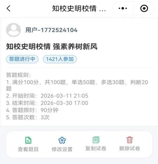 前期线上答题阶段旨在通过全员覆盖的知识检测,巩固前期学习成果。试题形式为单选题、多选题、判断题,系统随机生成100道试题。数字化的形式确保全员参与的便捷性,竞赛机制激发学生主动学习的动力。每一次答题都是一次自我检视,在学习中体悟作为南院人的自豪,在错题中发现认知盲区,实现知识的巩固与深化,完成“知校”的全面检验。