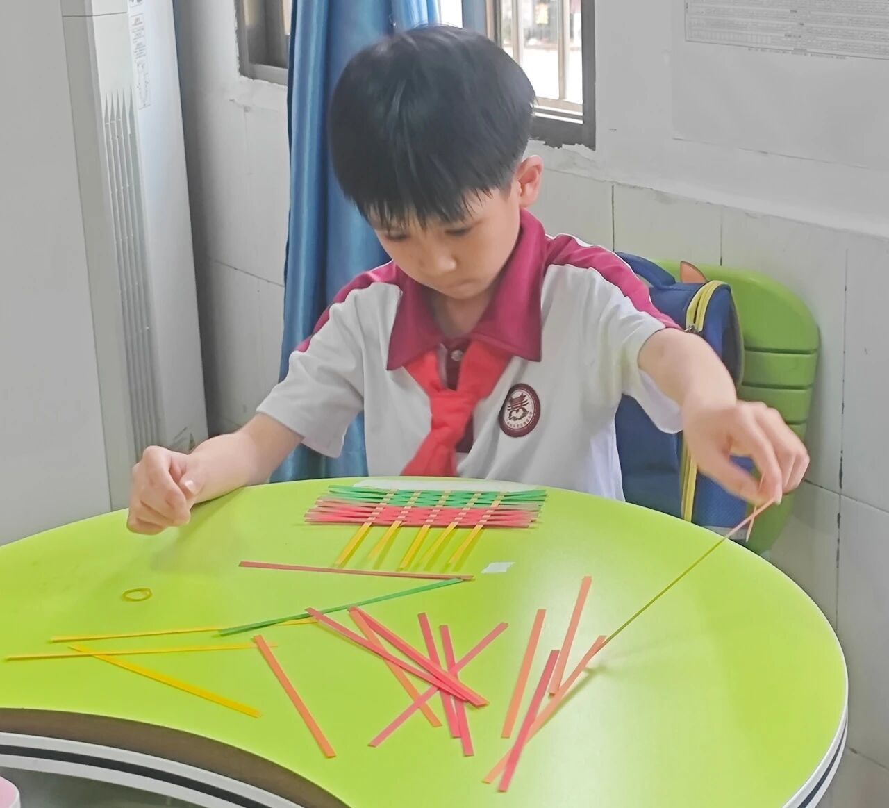 在实践环节,小王老师逐步演示竹材处理,从竹子到编织材料的加工步骤,并重点讲解了十字编技法的操作要点。随后,她与小助手为同学们分发材料工具,引导大家从基础编法入手,使用彩色竹条创作出风格各异的平面作品。掌握十字编后,同学们进一步挑战竹编灯笼的制作,不少同学结合创意,将灯笼编织成兔子、玉穗等造型,展现出丰富的想象力。