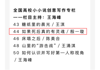 值此春意盎然之际,我院喜传捷报!我院2023级汉语言文学专业7班殷一璇同学创作的《如果死后真的有灵魂》发表于全国优秀微型小说原创期刊《天池小小说》,彰显我院育人成效与学子风采。