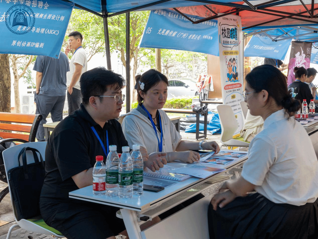 招聘会现场气氛热烈,人头攒动。本次招聘会有广州引力熊文化发展有限公司、无尾熊传媒(广州)有限公司、广州市白云区跳跳堂教育培训中心有限公司、镧景画面(广州)文化传播有限公司等20家企业开展线下招聘,同期有其它11家企业专门开辟线上投递直通渠道,涵盖了学科教师、视频剪辑、AIGC视频生图设计师、AI设计、剧本策划助理等共计94个岗位(线下53个岗位、线上41个岗位)。同学们手持简历、获奖证书及个人作品集,有序在各企业展位前驻足咨询,主动向招聘负责人了解岗位薪资、晋升机制、技能要求等核心问题。企业招聘负责人则耐心细致地答疑解惑,详细介绍企业概况与岗位详情,双方沟通深入,互动频频。