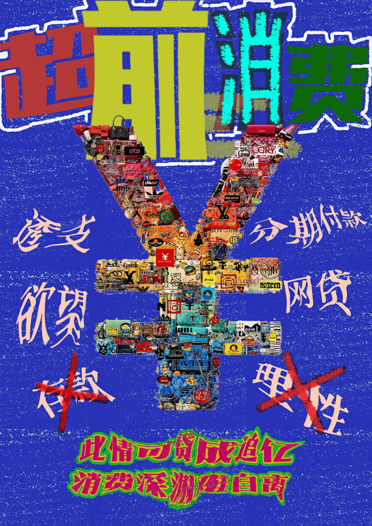 以“人民币符号”为核心视觉载体,用奢侈品、消费符号(信用卡、分期标识等)堆砌成符号形态,隐喻“超前消费看似是‘拥有财富’,实则是被物质欲望绑架”。 背景选用高饱和蓝色,并且增加颗粒质感,既强化视觉冲击,也暗喻消费陷阱的“浑浊与压迫感”;周围散落的“透支”“网贷”等关键词,直接点出超前消费的工具与本质,在超前消费的过程中,无论是存款还是理性,都被吞噬埋没;底部“此情可‘贷’成追亿,消费深渊难自离”的标语,谐音化的表达既增强记忆点,也讽刺了“借贷一时爽,负债成负担”的现实。