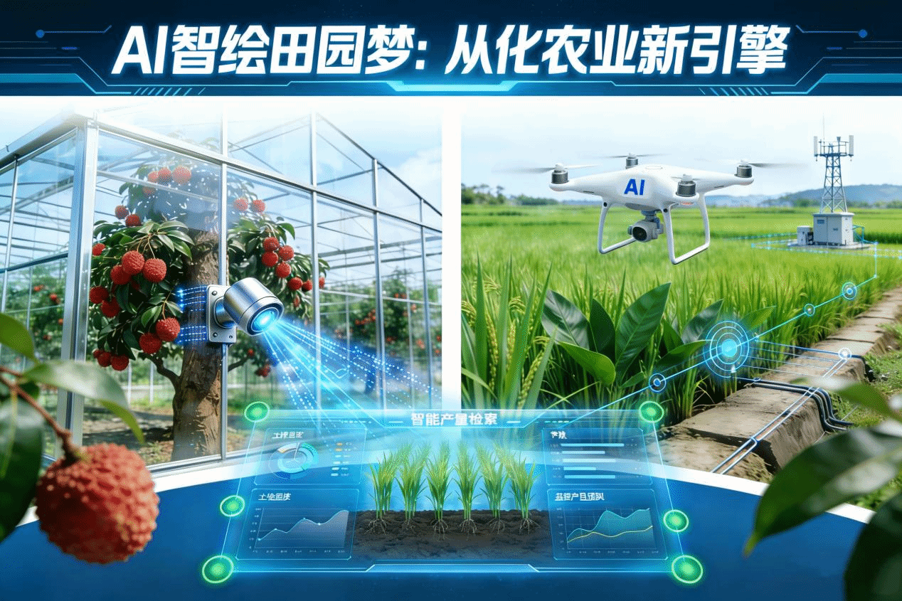 以从化特色物产(荔枝、稻作、家禽)为视觉锚点,通过虚实交织的画面(如荔枝旁的 AI 检测镜头、鸡舍的生长周期数据),呼应 “耕耘” 的在地性与 “硕果” 的科技附加值。整体设计既保留农耕的质朴温度,又凸显 AI 驱动下的效率跃升,传递 “从化以智为犁,让每一份耕耘都结出精准、高产的时代硕果” 的核心主张,让传统农业的新生命力直观可感。