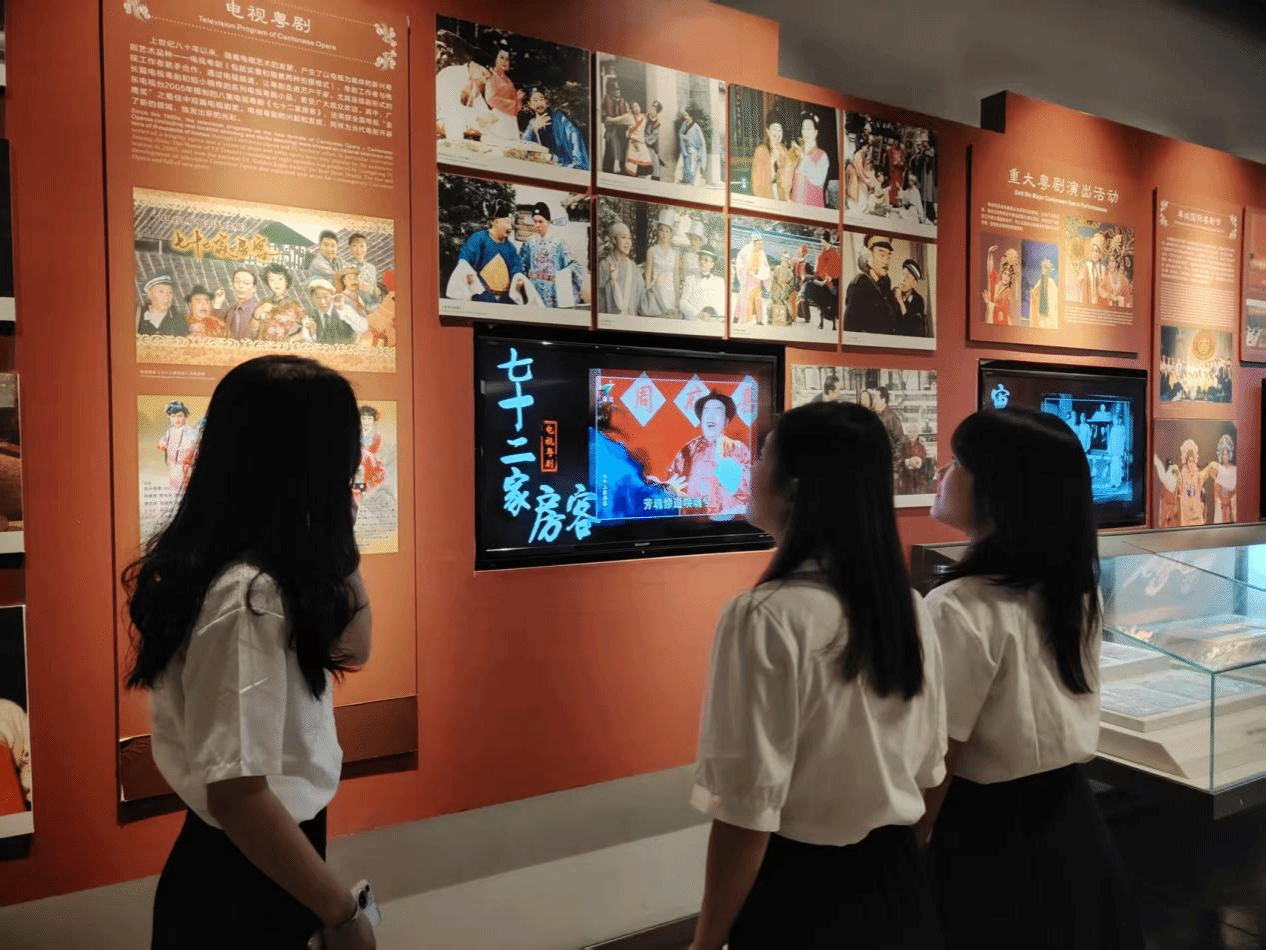 进入博物馆,映入眼帘的是一面面播放着粤剧相关影像的屏幕:既有妆容描绘的细致的过程,也有老艺术家的经典唱段。关汉卿的“望前程万里”,红线女的“梦魂难望到家乡”,一字一句中凝聚着老艺术家们的心血,唱念做打里有着中华文化的底蕴。师生纷纷戴上视频下的耳机,看着视频中的故事,用心倾听着“文化的声音”。