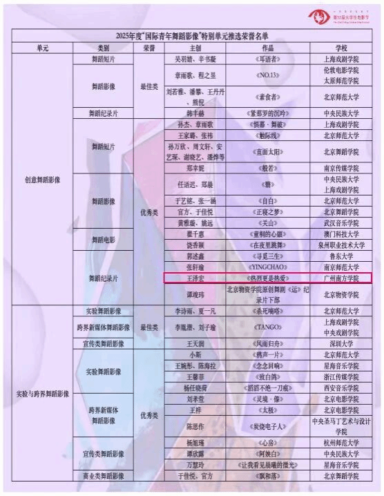6月10日,北京国际电影节·第32届大学生电影节“原创之夜”在北京师范大学(海淀校区)顺利举办。本届大学生原创作品再创新高,共有海内外10多个国家的300多所高校参与,各单元征集作品共3000余部,其中“国际青年舞蹈影像”特别单元创作精品256部,经过多轮遴选,最终有87部优秀作品脱颖而出入围终审环节,在终审环节只有18部获得2025年度“国际青年舞蹈影像”特别单元推选荣誉名单。我院由肖洁夏老师指导的2021级网络与新媒体专业同学王泽宏的作品《是热烈更是热爱》成功入围,并获得创意舞蹈影像单元舞蹈纪录片优秀奖,项目团队受邀请参加北京师范大举行的颁奖仪式,伟德bv国际体育派出胡美香教授代表团队参加领奖。