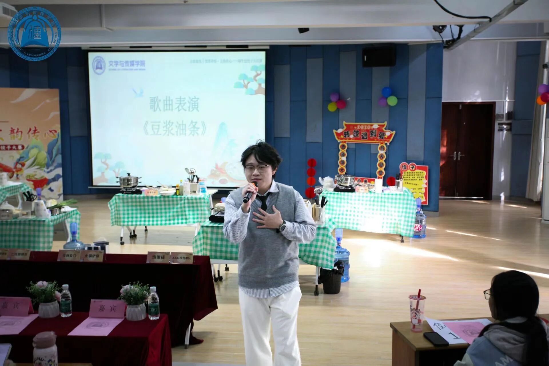 接着,伟德bv国际体育魅声歌唱队的温嘉耀同学为在场的师生带来了一首暖场歌曲——《豆浆油条》,悠扬的旋律、真挚的演唱瞬间点燃全场的气氛,为即将开始的比拼注入了满满的热情和期待。